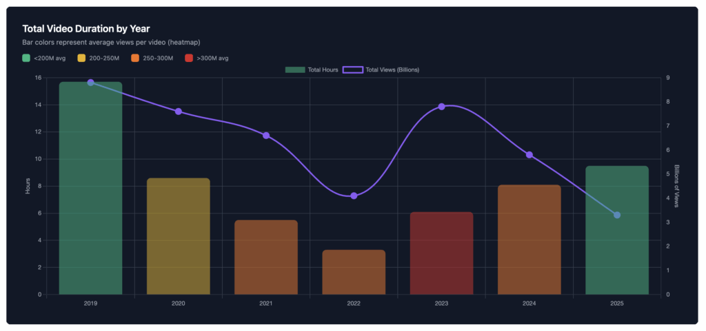 The MrBeast channel has posted 9.5 hours of finished content in 2025 so far. 24 videos have generated 3.3 billion views. That’s 347 million views per hour of content.